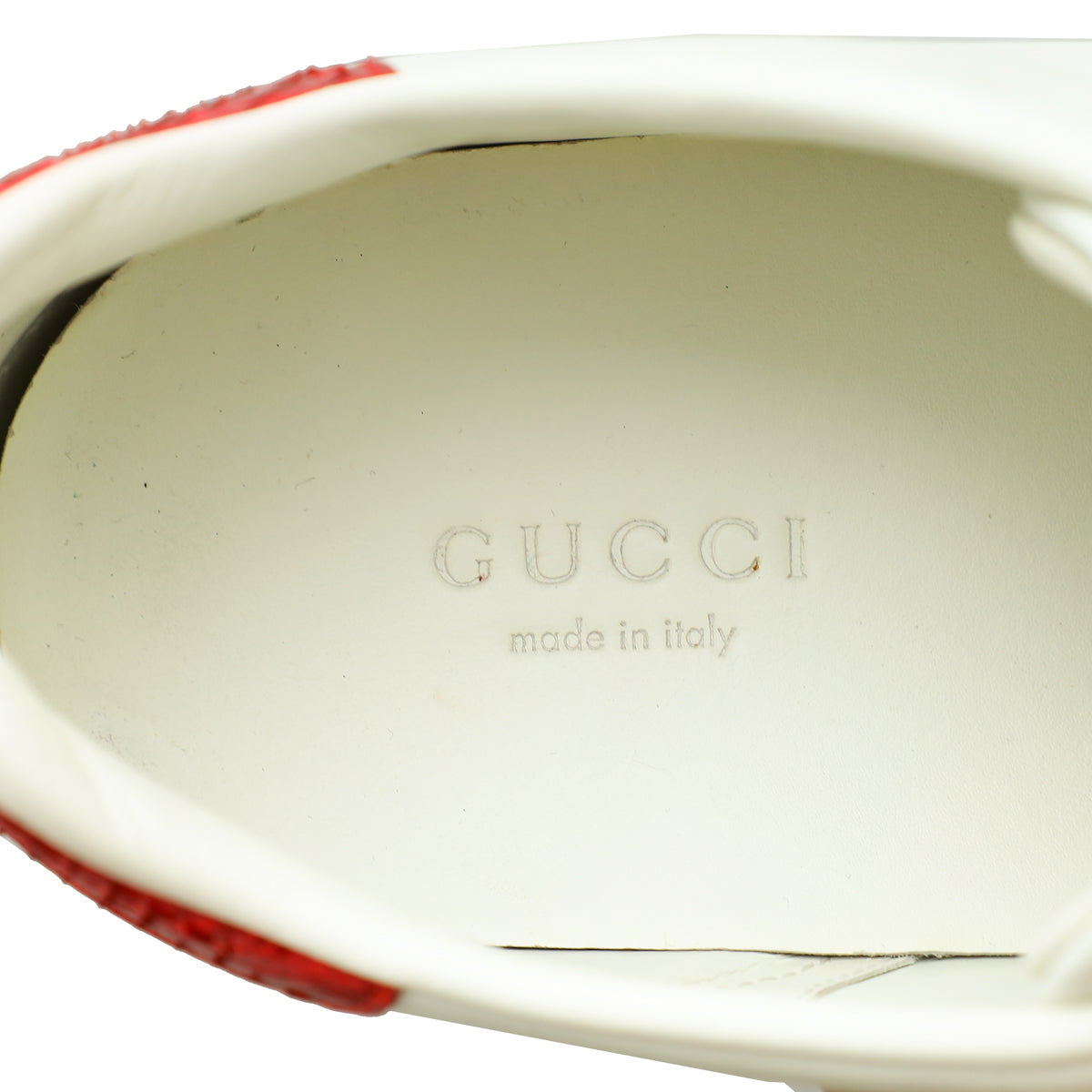 Material: White Leather with Green/Red Web Embroidered Patches of Ladybug, Stars, and Pineapple and Red Snakeskin Leather Detail on The Back of One Shoe and Green on The Other.
