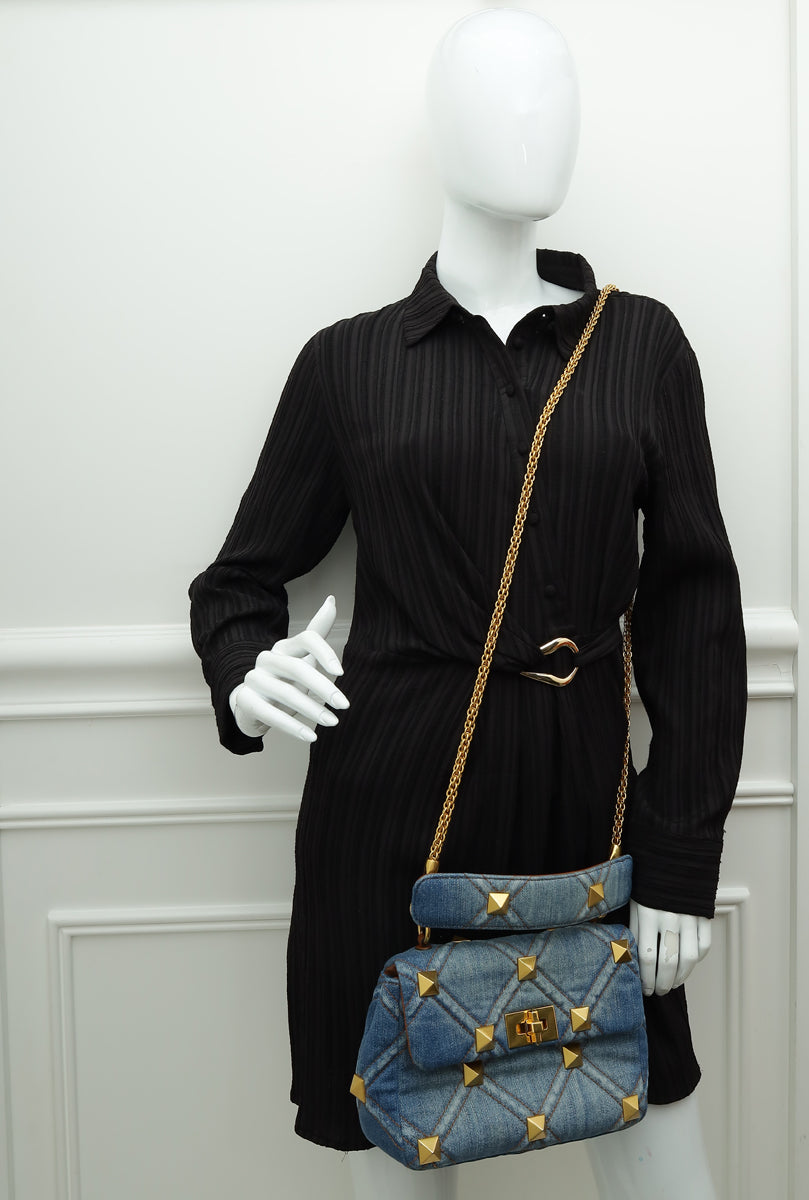 Valentino Bicolor Denim Roman Stud Top Handle Flap Bag