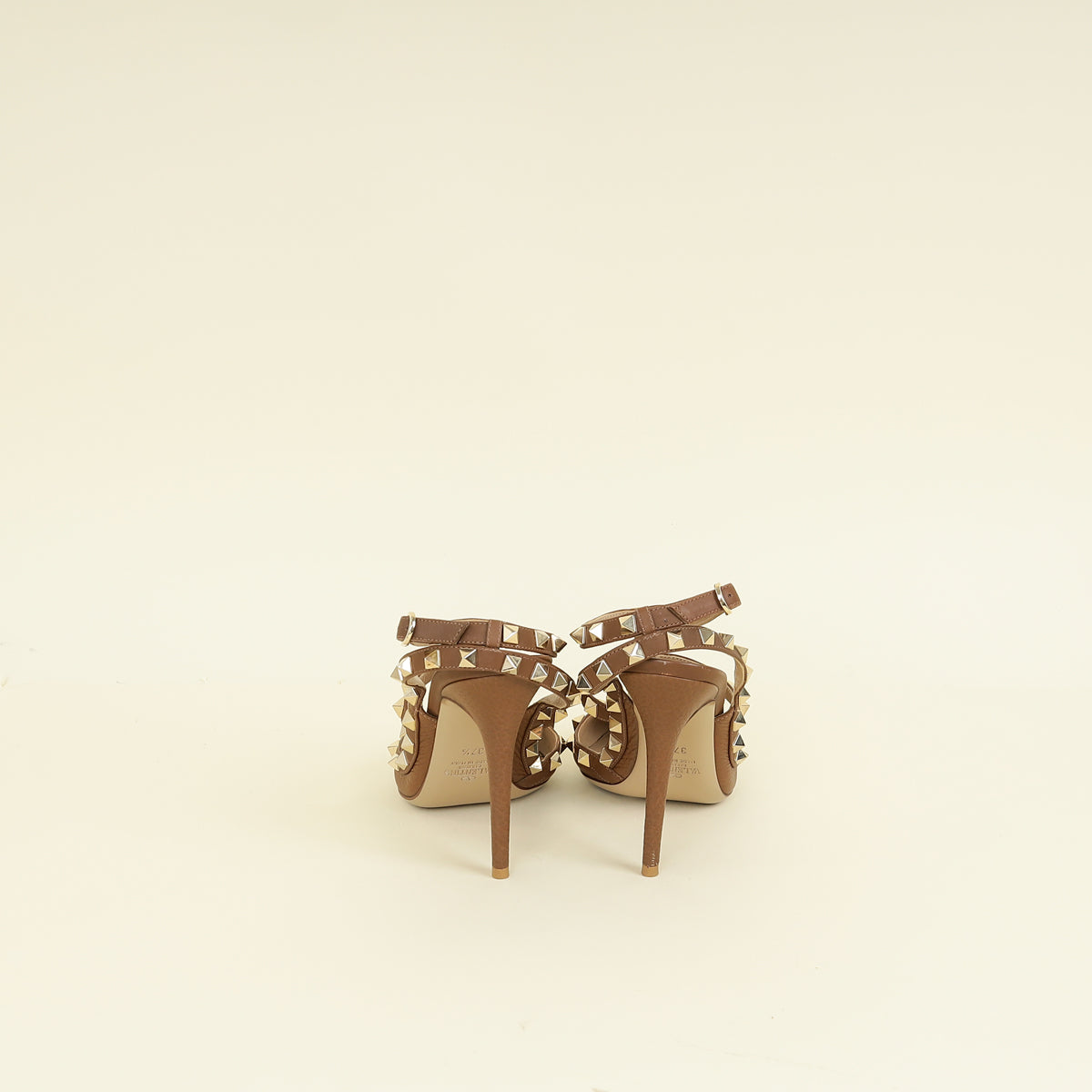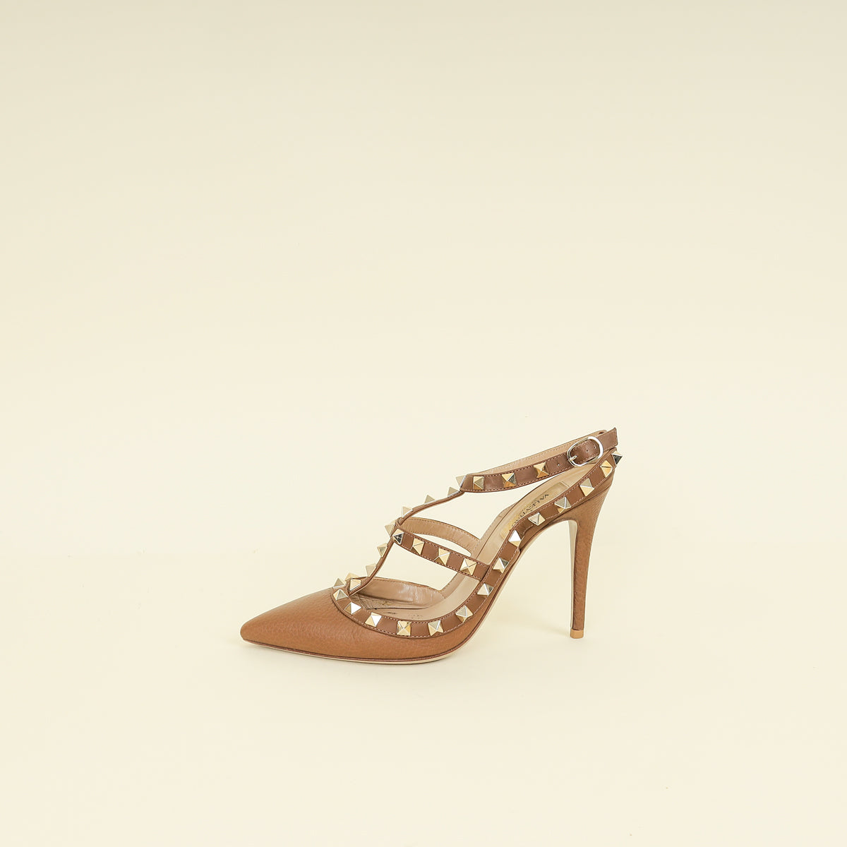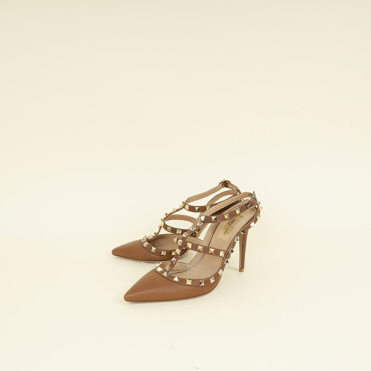 Valentino Brown Rockstud Caged Ankle Strap Pump 37.5